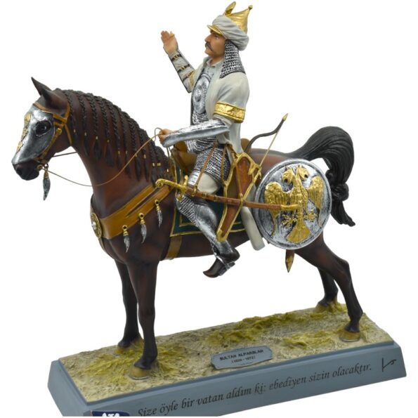 Sultan Alparslan’ın klasik miğferi, Selçuklu çift başlı kartal armalı kalkanı ve savaş atı üzerindeki duruşu ile bu biblo, “Size öyle bir vatan aldım ki; ebediyen sizin olacaktır.” sözüyle birlikte sunulur.